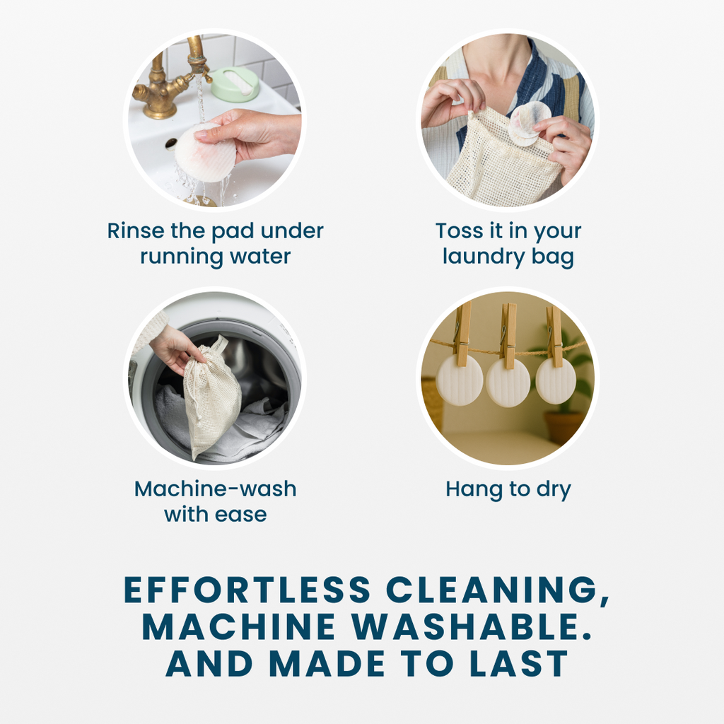 Vous pouvez laver vos disques démaquillants réutilisables à la main après chaque utilisation. Il suffit d'ajouter un peu d'eau et de savon et de les laisser sécher à plat. Vous pouvez également les laver en machine (30°C est la meilleure solution pour l'environnement, mais 60°C convient également). Pour les conserver en toute sécurité, nous vous conseillons d'utiliser un sac à linge.
